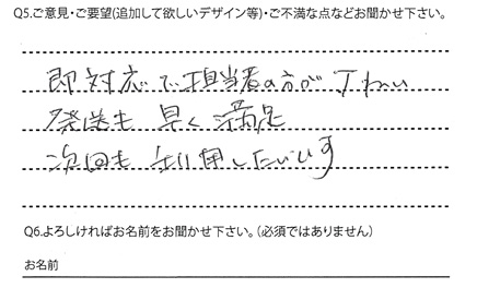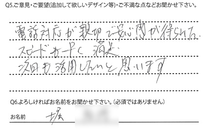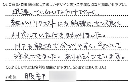 素早い対応、丁寧な仕上がりに大変感謝しております。