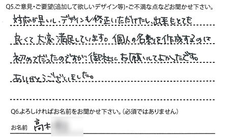 こちらこそ今後もご愛顧いただけますようご満足いただける名刺作りに精進してまいります。